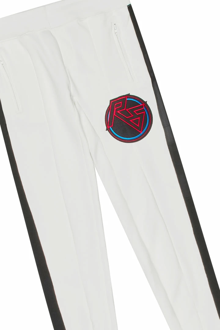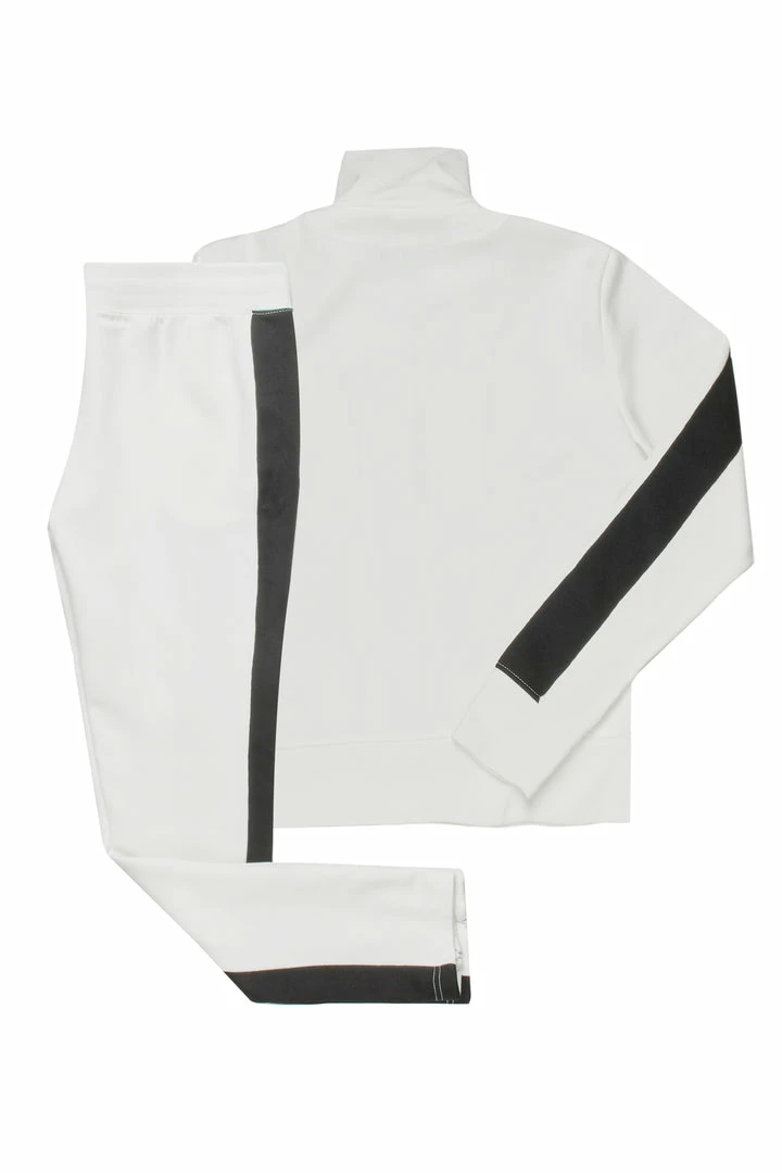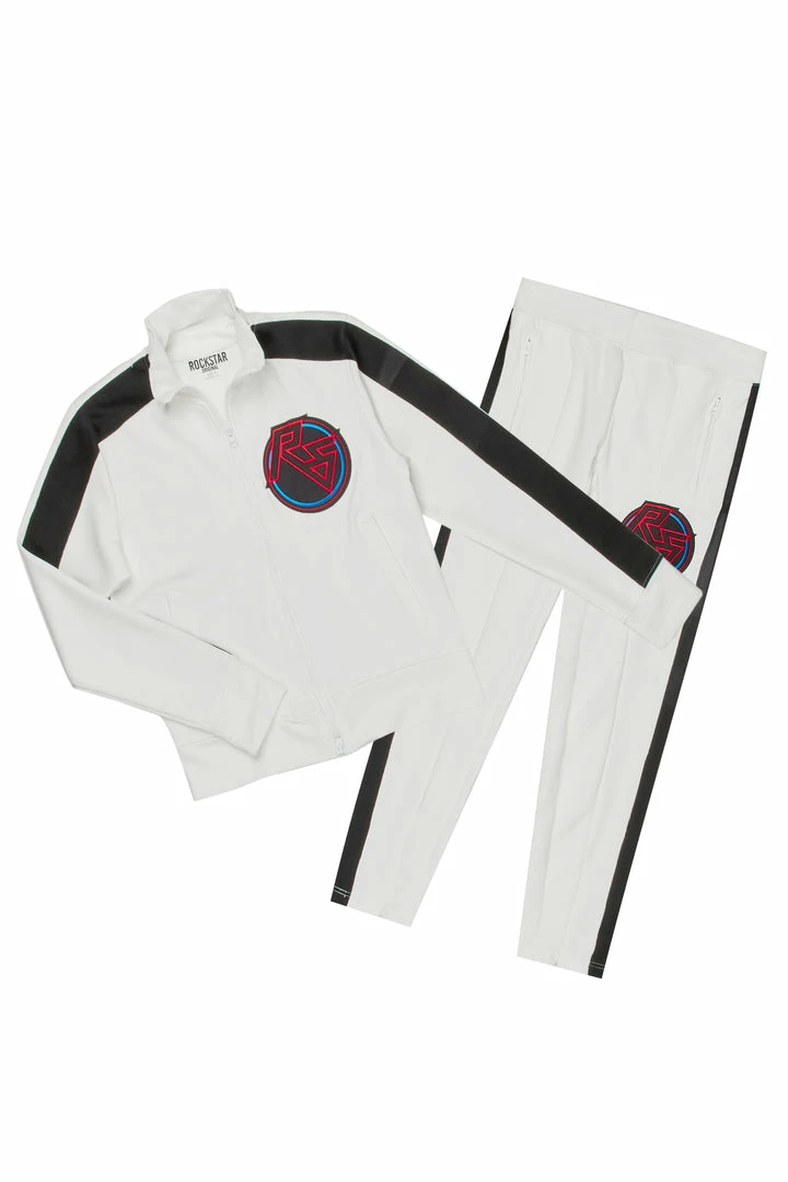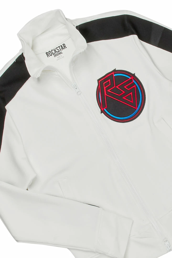 Rockstar Original Women’s tracksuit set in pure white. Featuring embroidered RSO logos with contrast side stripe accentsย down the sleeves and legs. This gorgeous two-piece set accentsย a high quality front zipper closure and cuffed hems on the top and a fitted waistband, side pockets andย ankle zipper accents on the bottoms.ย The ultimate triple threat ensemble โ fitted, flexible and fierce!ย