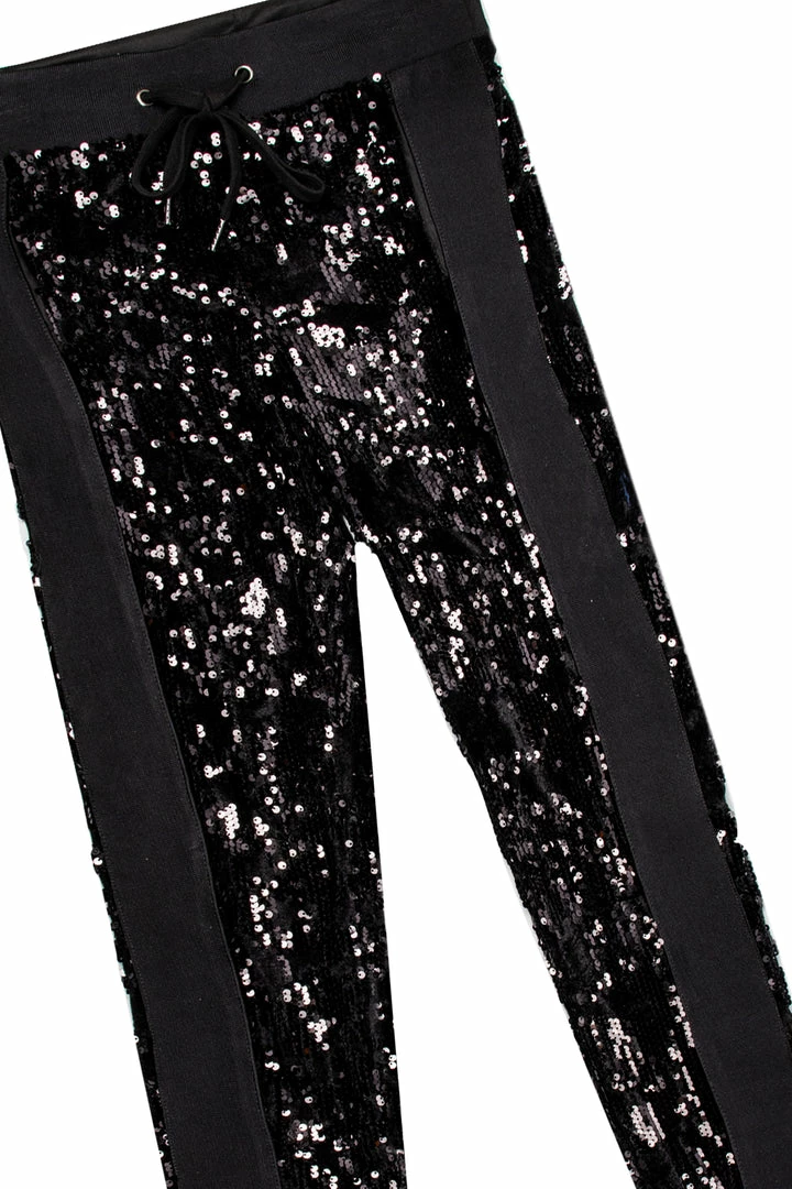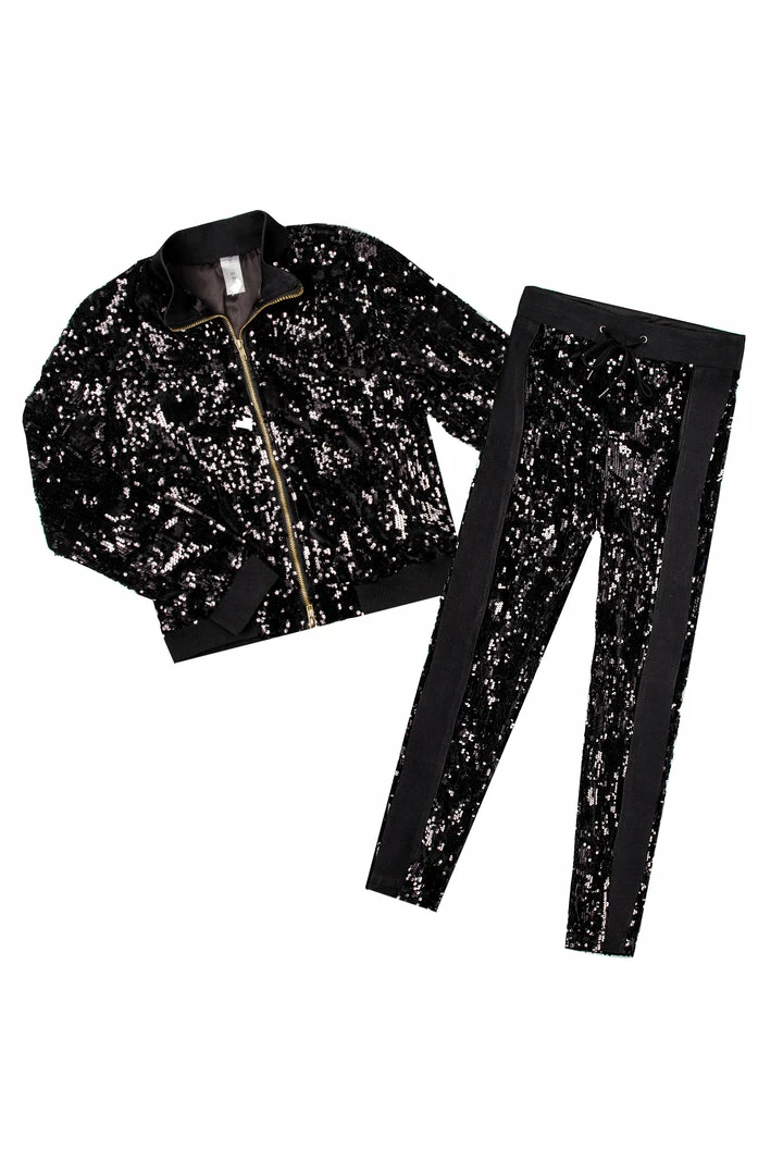 Rockstar Original Women’s tracksuit set in shimmering black. Featuring sparkling sequin designing throughout. This gorgeous two-piece set accents a high quality front zipper closure and cuffed hems on the top and a drawstring waistband with soft stripe accents on the bottoms. The ultimate triple threat ensemble — fitted, flexible and fierce!