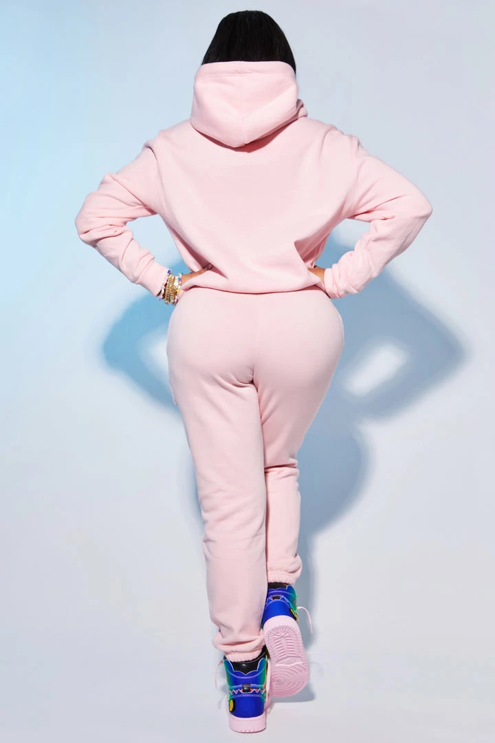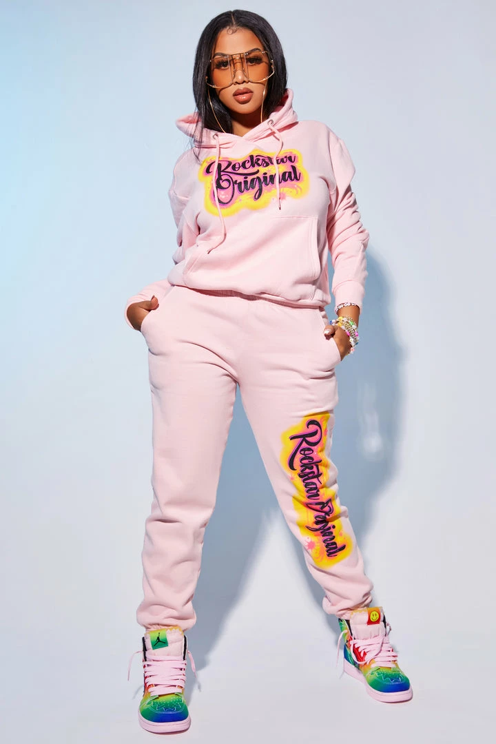 Rockstar Original Women’s tracksuit set in soft pink. Featuring a multi color custom printed graffiti style RSO logo on the top and bottoms. This gorgeous two-piece set accents a drawstring hood, front pocket and cuffed hems on the top and a fitted waistband, side pockets and cuffed hems on the bottoms. Look good and feel better all day with this must-have set!