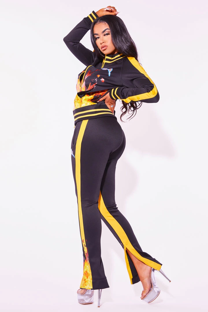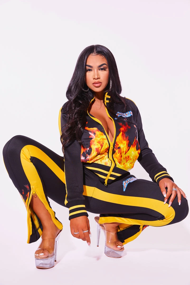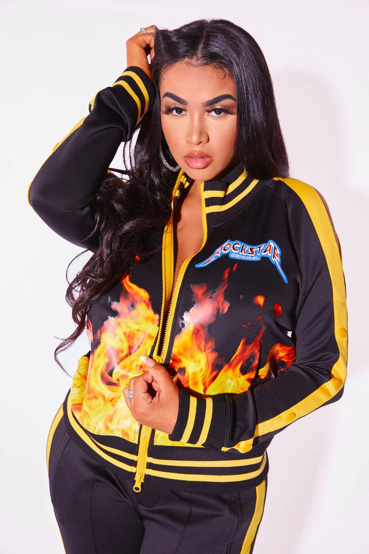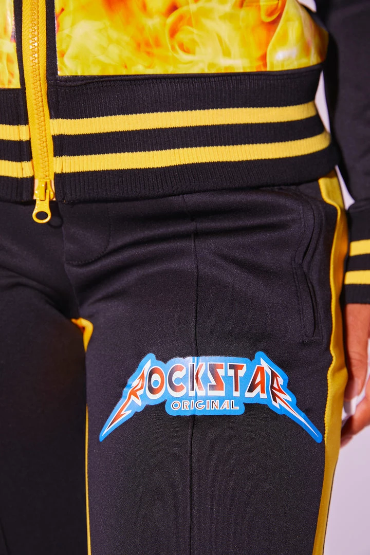 Rockstar Original Women’s tracksuit set in black. Featuring printed RSO logos with bold flame graphics throughout. This gorgeous two-piece set accents a high quality front zipper closure and cuffed hems on the top and a fitted waistband, side pockets and ankle zipper accents on the bottoms. The ultimate triple threat ensemble — fitted, flexible and fierce!