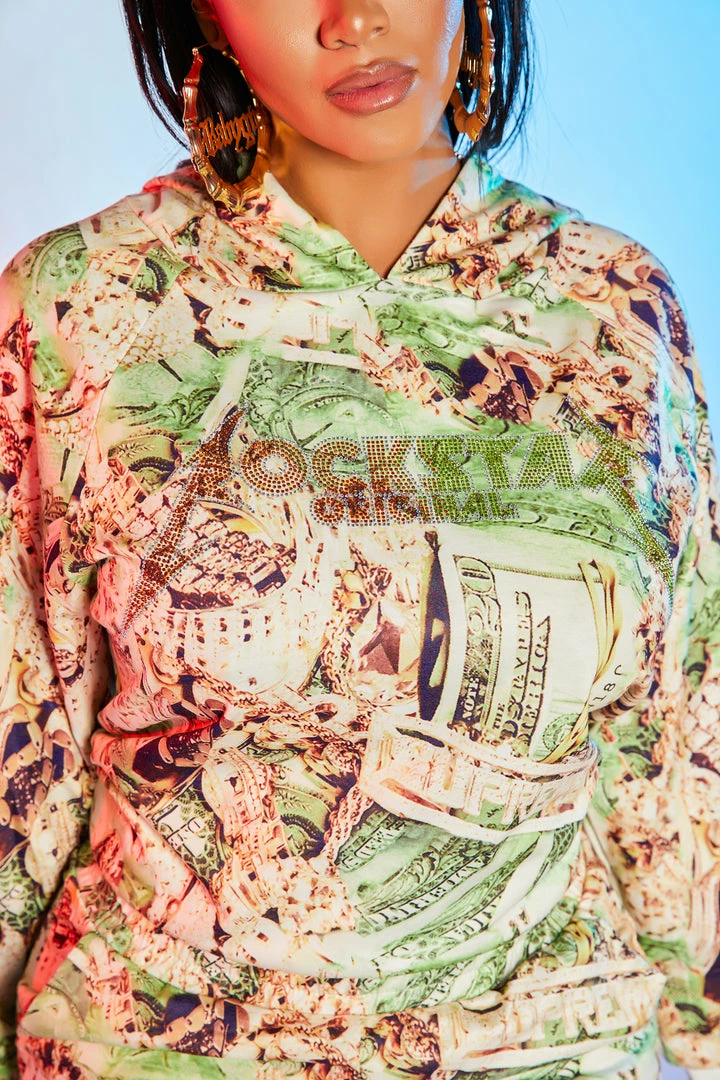 Rockstar Original Women’s two-piece tracksuit set in multi money pattern green. Featuring rhinestone RSO logos throughout. Top accents a drawstring hood, front pockets and elastic cuffs. Bottoms accent side pockets with a elastic waistband, elastic cuffs and premium cotton threading for style and comfort.