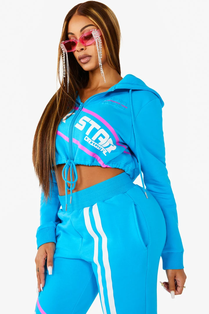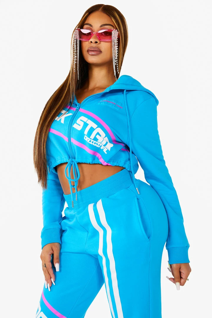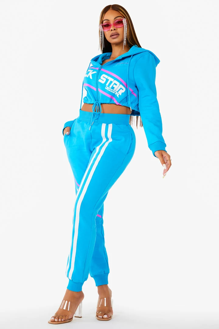 Rubi Rose x Rockstar Original Women’s two-piece crop top tracksuit set in too turnt turquoise. Featuring printed RSO logos on the top and bottoms with a stripe designing on the pant. Stay fitted and fashion-forward with this set that accents a drawstring hood and hem, high quality zipper closure, fitted waistband and pockets for comfort and convenience.
