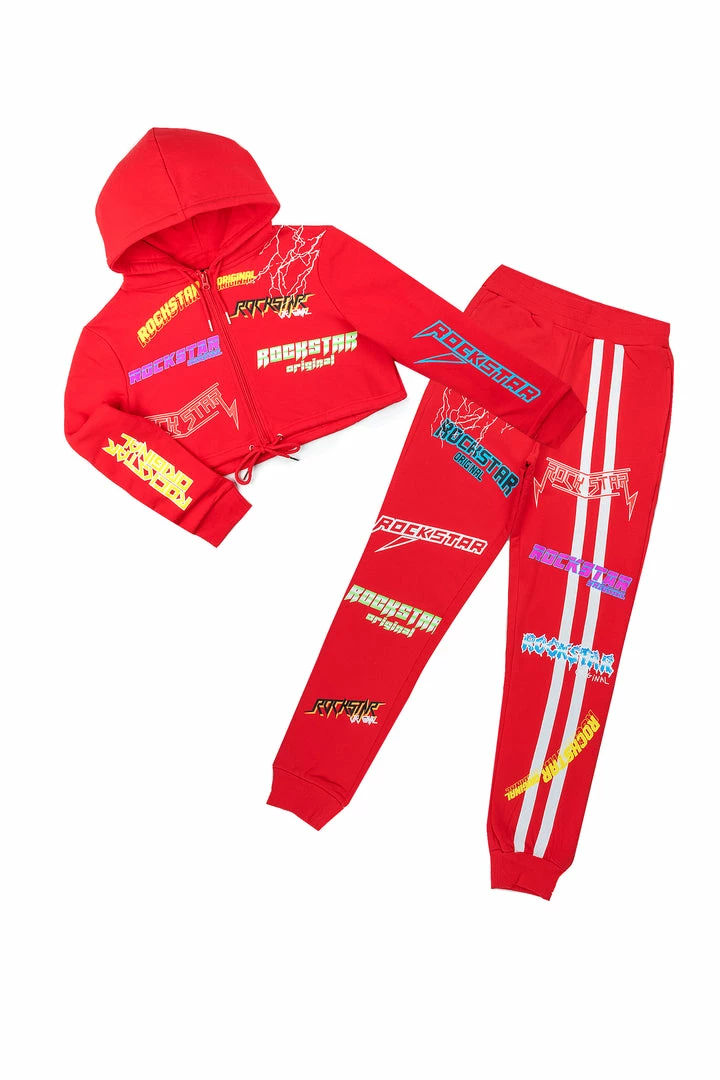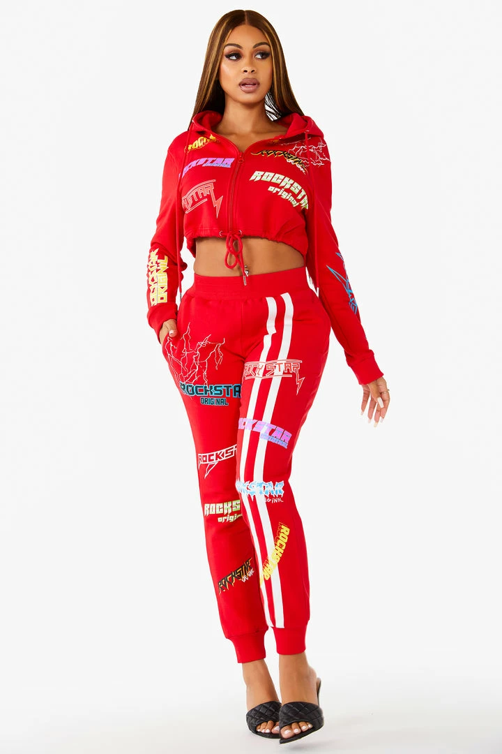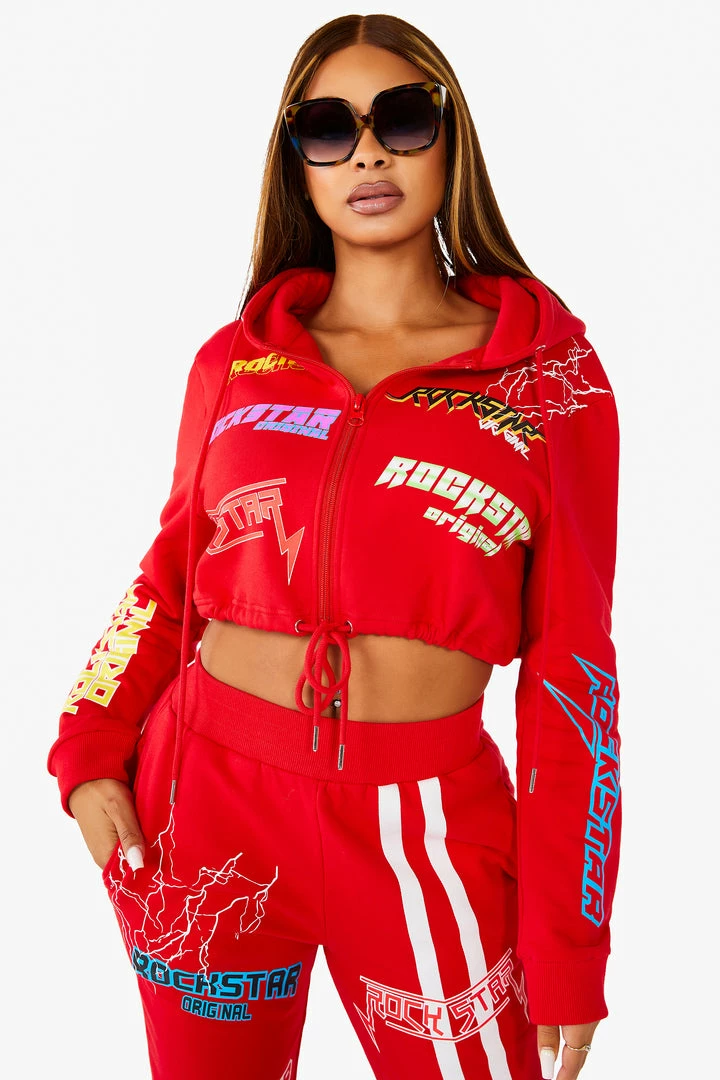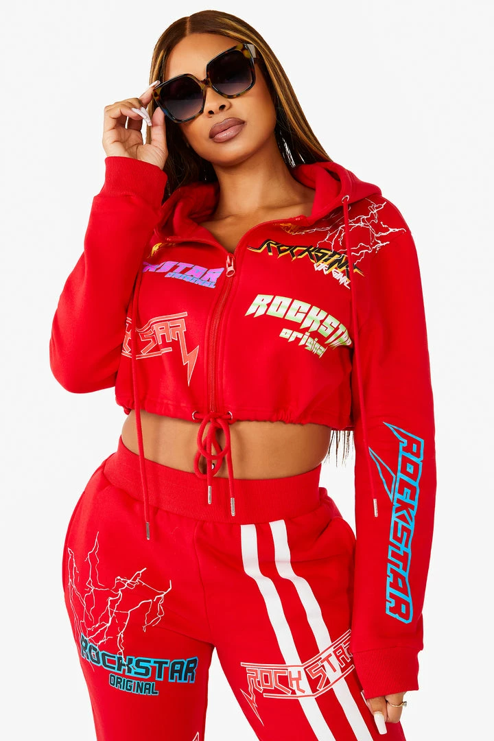 Rockstar Original Women’s two-piece crop top tracksuit set in Rockstar red. Featuring printed multi color RSO logos throughout with a stripe designing on the pant. Stay fitted and fashion-forward with this set that accents a drawstring hood and hem, high quality zipper closure, fitted waistband and pockets for comfort and convenience.