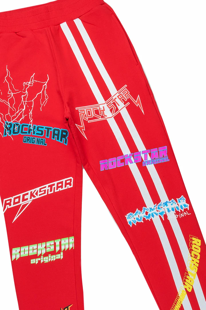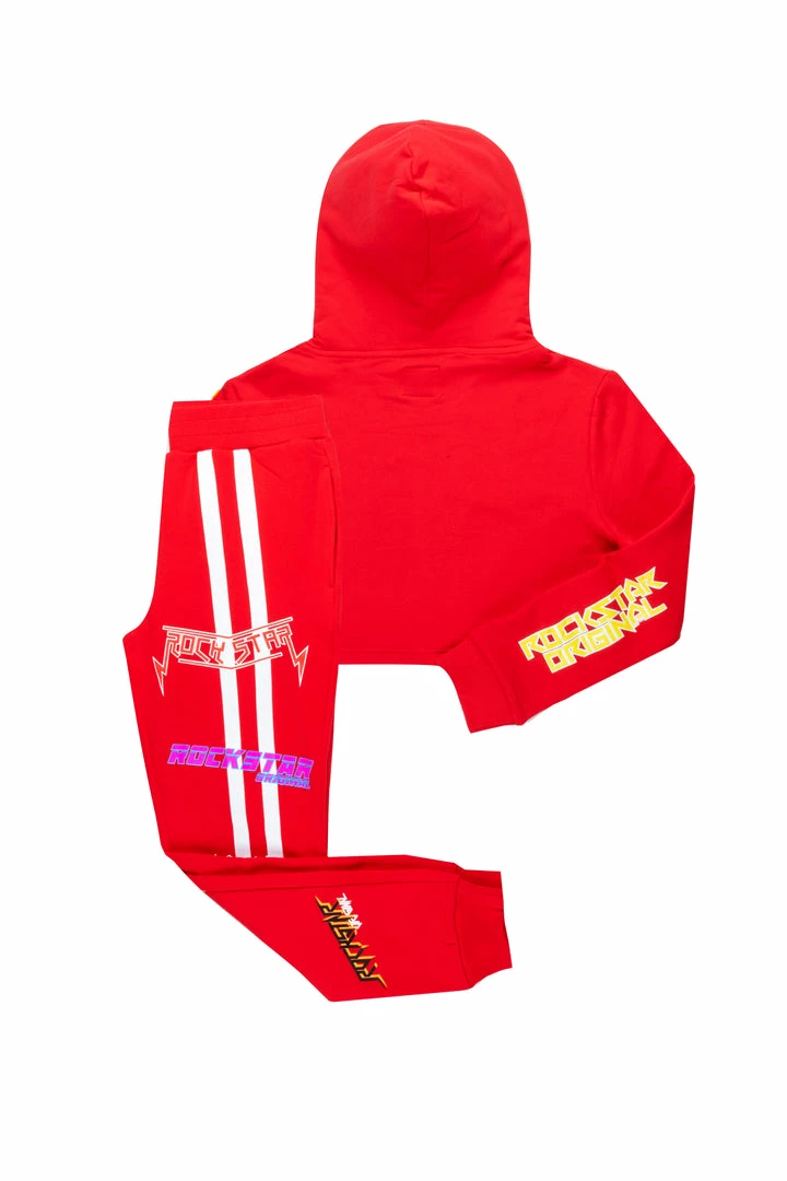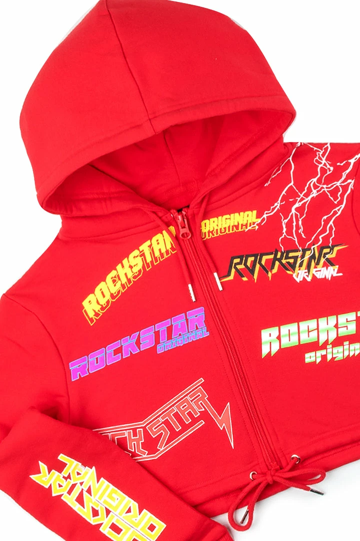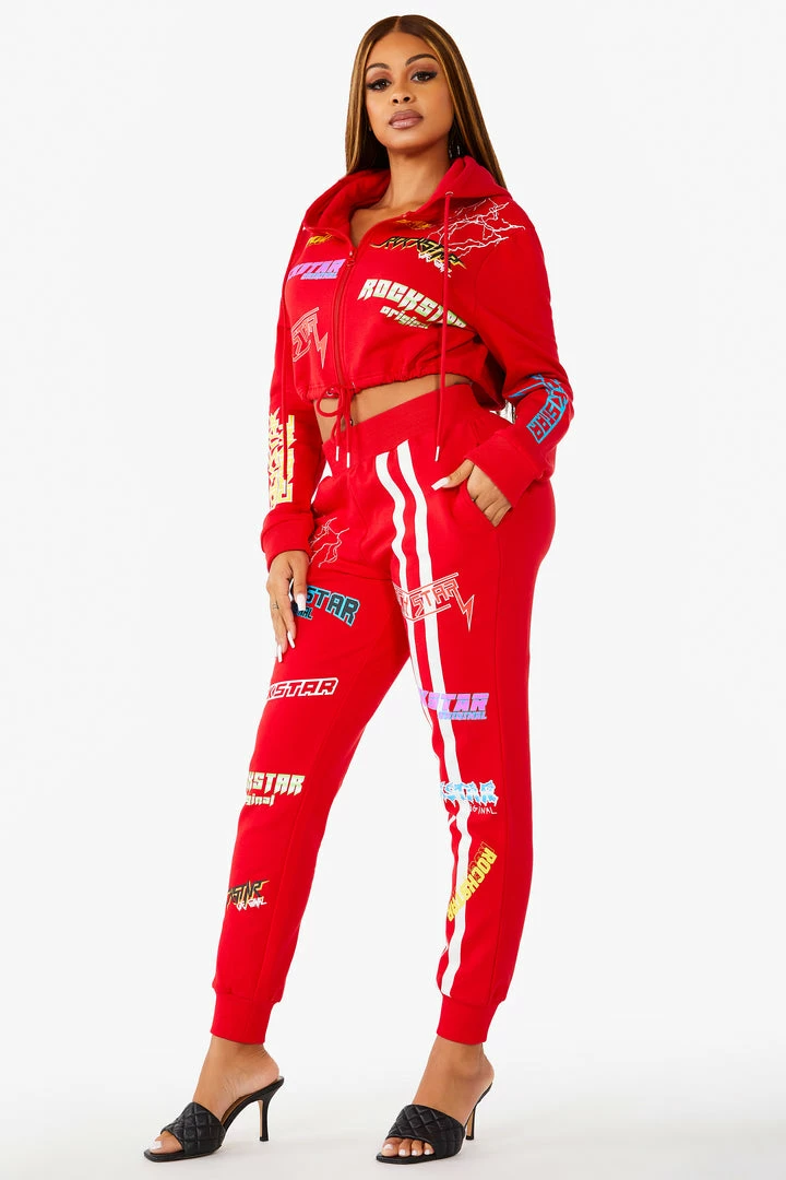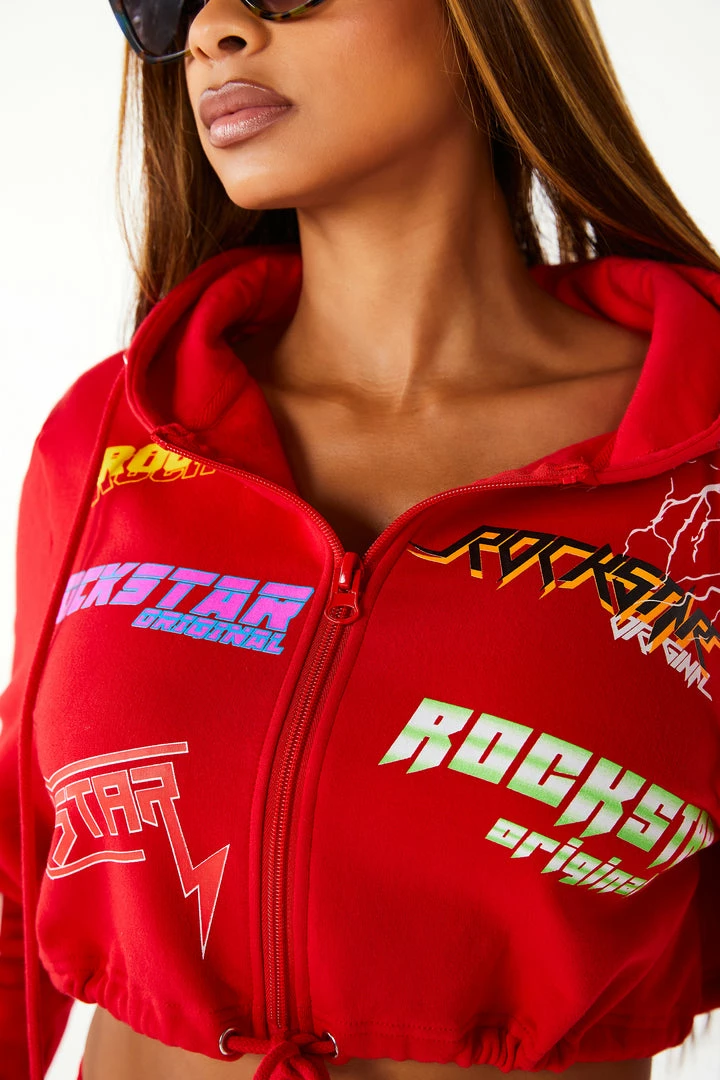 Rockstar Original Women’s two-piece crop top tracksuit set in Rockstar red. Featuring printed multi color RSO logos throughout with a stripe designing on the pant. Stay fitted and fashion-forward with this set that accents a drawstring hood and hem, high quality zipper closure, fitted waistband and pockets for comfort and convenience.