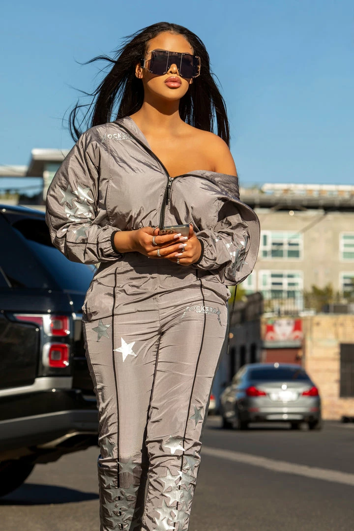Rockstar Original Women’s two-piece tracksuit set in taupe. Featuring printed RSO logos on the top and bottom with star graphics, inner mesh lining and pleated holographic detailing throughout. Jacket accents a high quality front zip closure with a drawstring hood and elastic ribbed hem. Bottoms accent an elastic waistband with side pockets and button fastening inseams. Style with your favorite sneakers for a sporty RSO babe OOTD.