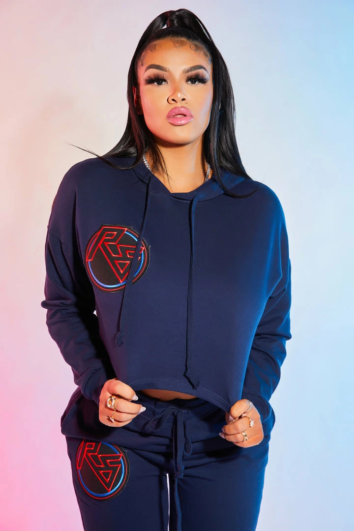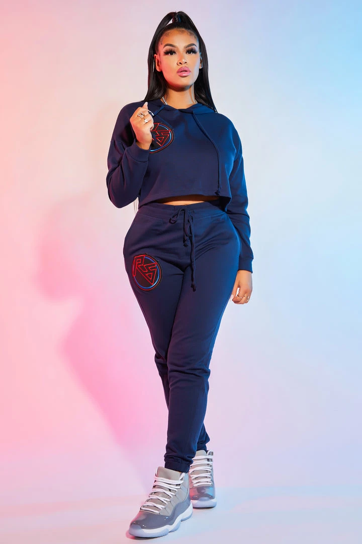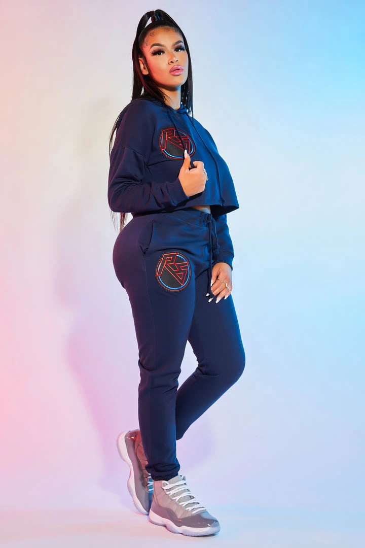 Rockstar Original Women’s crop top two-piece tracksuit set in navy. Featuring multi color embroidered RSO logos throughout. This new must-have is designed with a drawstring hood and cropped length on the top and two pockets on the bottoms with elastic cuffs. Style with your favorite sneakers or booties for a casual going-out look.